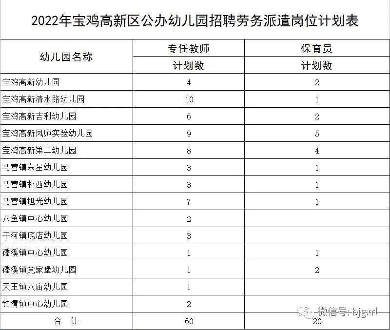为促进高新区学前教育事业的发展,满足高新区适龄儿童入园需求,宝鸡高新区本着公平、公正、公开的原则,面向社会公开招聘高新区公办幼儿园合同制工作人员(劳务派遣方式,非事业在编)。现将有关事宜公告如下: